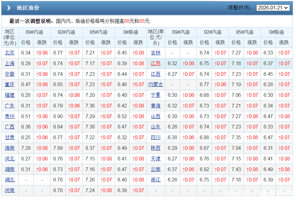 元月渐入尾声,在国内汽柴油方面,基于汽柴油以10个工作日为调价周期,本周初(1月20日),今年第2次调价,汽柴油恢复上涨,油价统计上涨85元/吨,折合各种92/95号汽油以及0号柴油等油品上涨0.07元/升。此次油价上涨后,2026年“首涨”仅是开端,下次调价时间确定,2月3日24时,国内汽柴油“恐大涨”,分析如下: